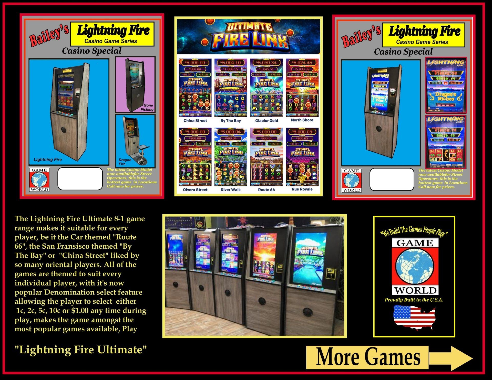 The Firelink Ultimate 8-in-one is one of the most popular games played in the casinos, with the adjustable denominations it can be played on a variety of coin values, from 1c through $1.00, allowing a player to increase or decrease their stakes at any time, with features never before seen on previous casino games. Players will enjoy these games in your "Man Cave" as if they were in a casino in Las Vegas. Be the envy of all your friends with your Lightning Link game.